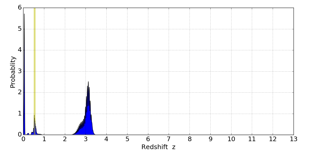 In P(z) plots: Yellow lines mark the cluster redshift z = 0.546,