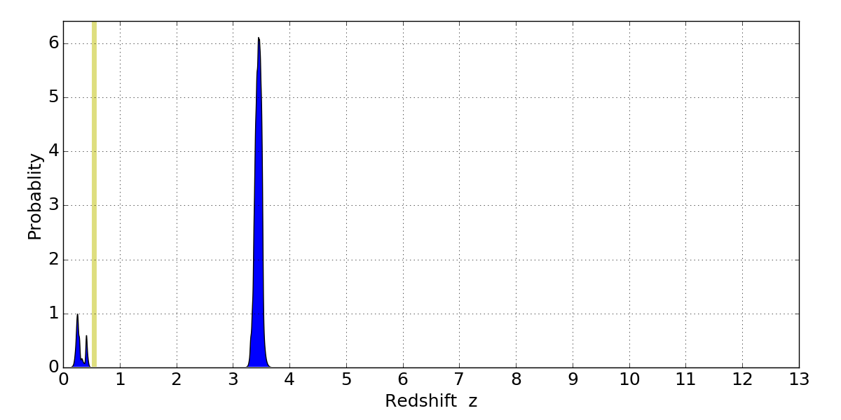 In P(z) plots: Yellow lines mark the cluster redshift z = 0.546,