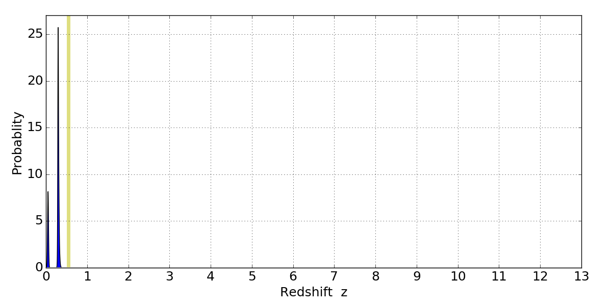 In P(z) plots: Yellow lines mark the cluster redshift z = 0.546,