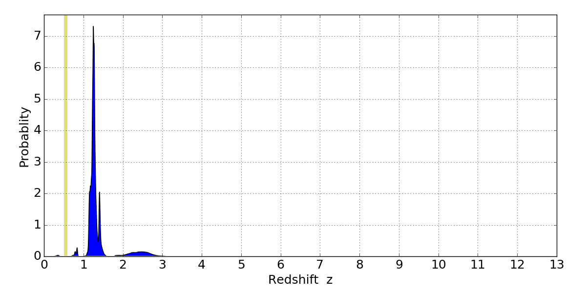 In P(z) plots: Yellow lines mark the cluster redshift z = 0.546,