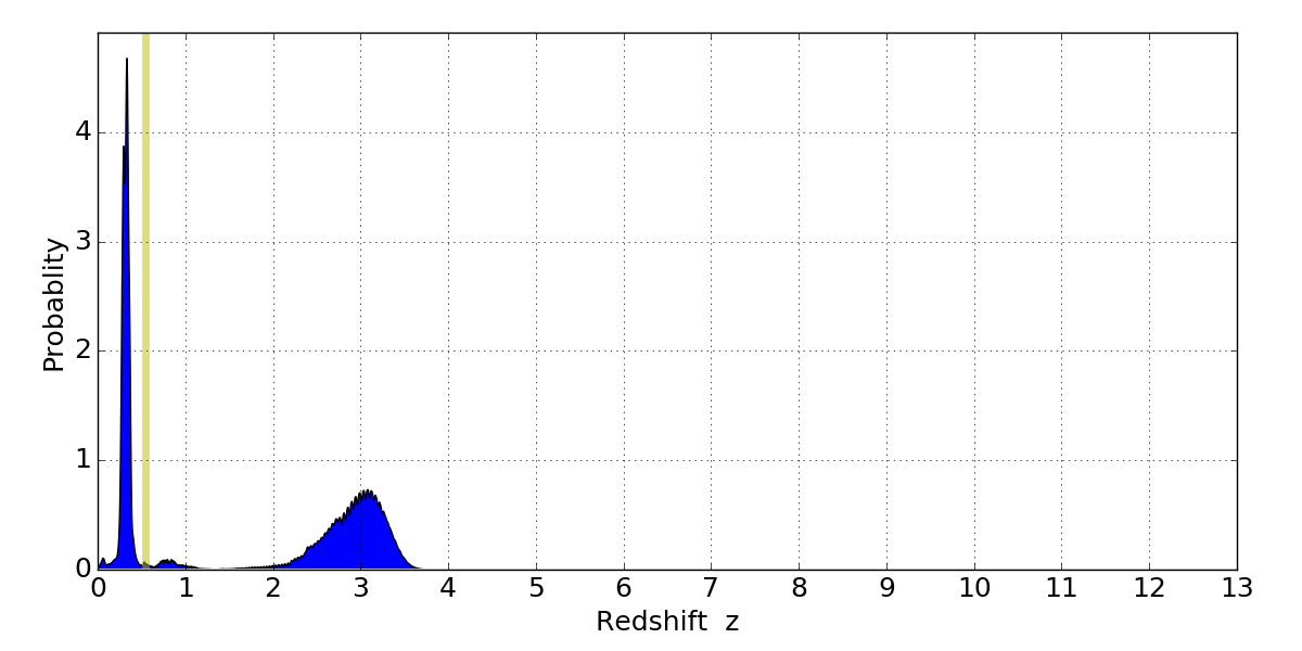 In P(z) plots: Yellow lines mark the cluster redshift z = 0.546,