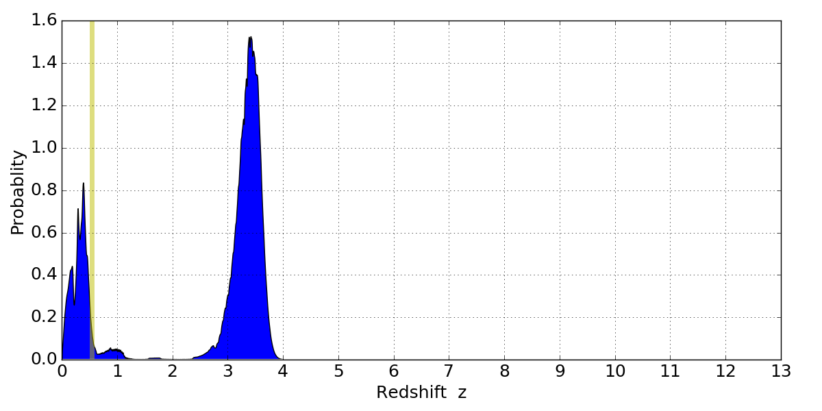 In P(z) plots: Yellow lines mark the cluster redshift z = 0.546,