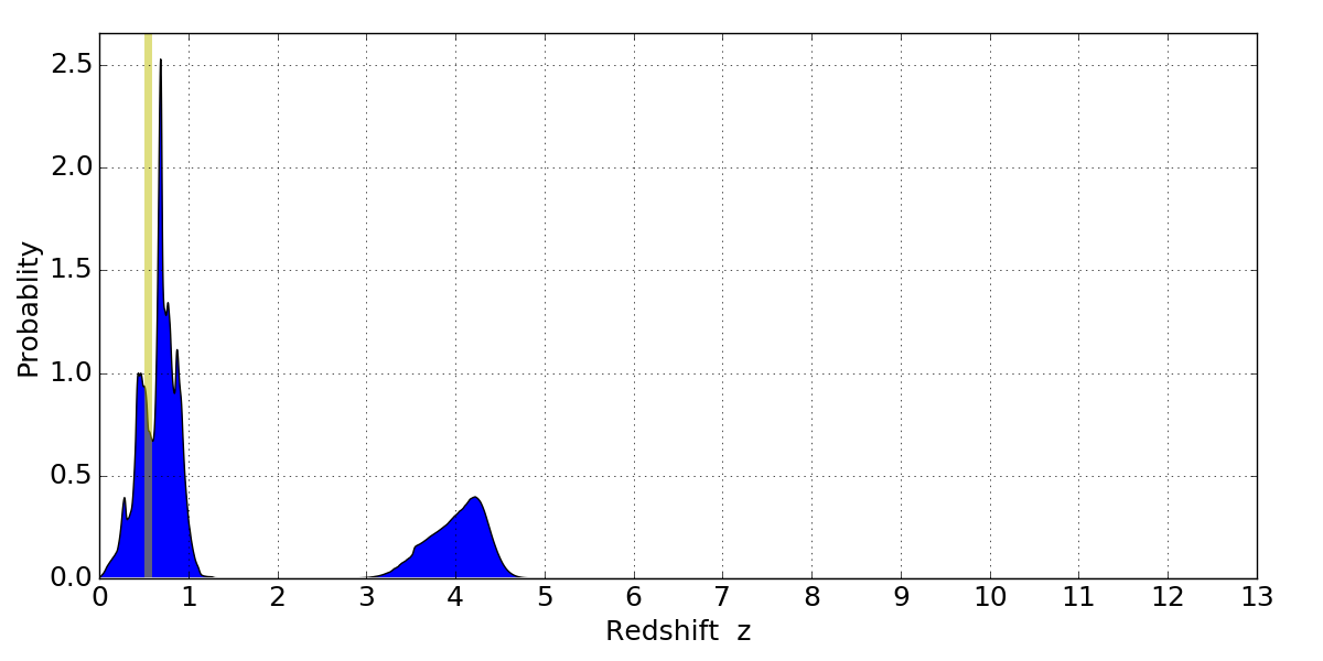 In P(z) plots: Yellow lines mark the cluster redshift z = 0.546,