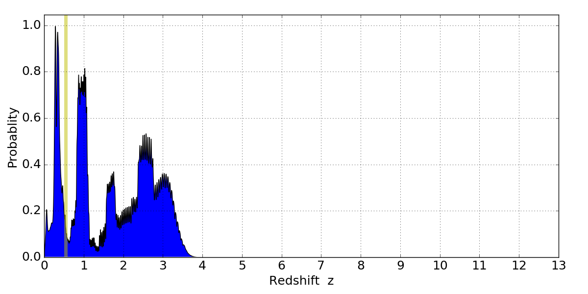 In P(z) plots: Yellow lines mark the cluster redshift z = 0.546,