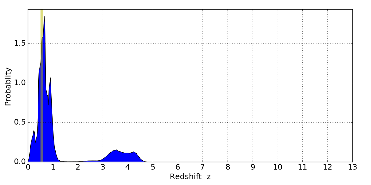 In P(z) plots: Yellow lines mark the cluster redshift z = 0.546,