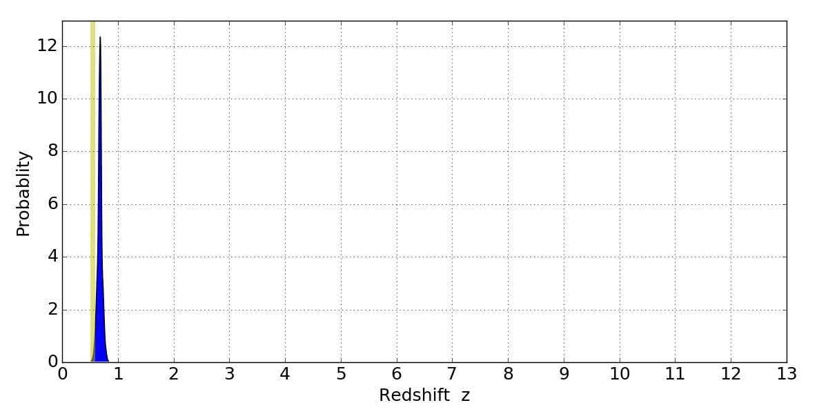 In P(z) plots: Yellow lines mark the cluster redshift z = 0.546,