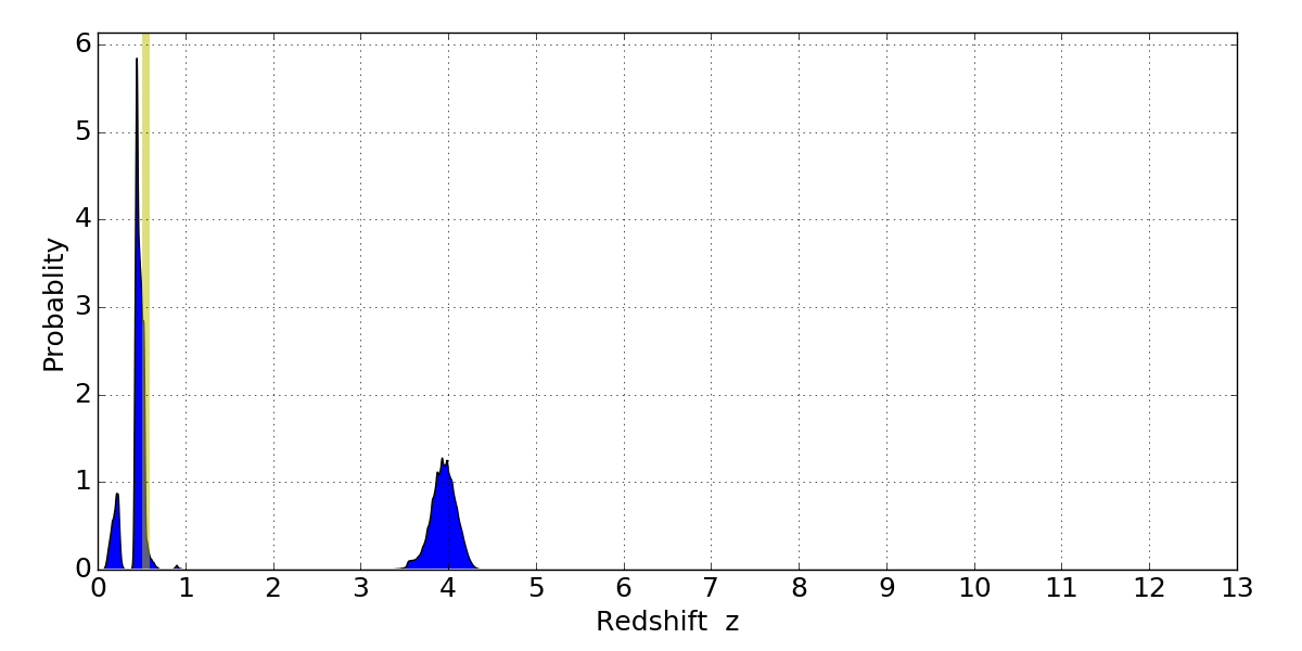 In P(z) plots: Yellow lines mark the cluster redshift z = 0.546,