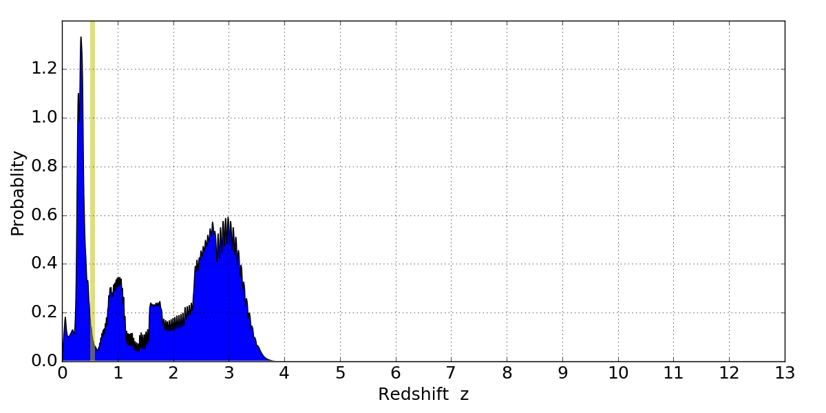 In P(z) plots: Yellow lines mark the cluster redshift z = 0.546,