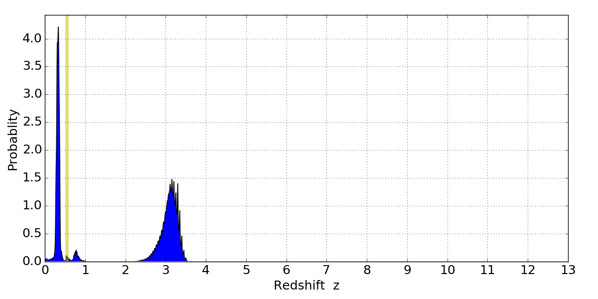 In P(z) plots: Yellow lines mark the cluster redshift z = 0.546,