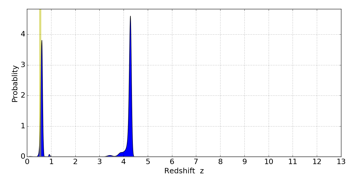 In P(z) plots: Yellow lines mark the cluster redshift z = 0.546,