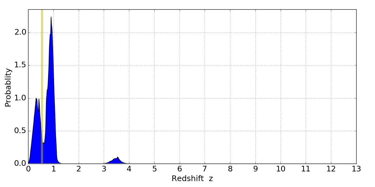 In P(z) plots: Yellow lines mark the cluster redshift z = 0.546,