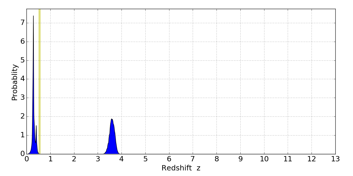 In P(z) plots: Yellow lines mark the cluster redshift z = 0.546,