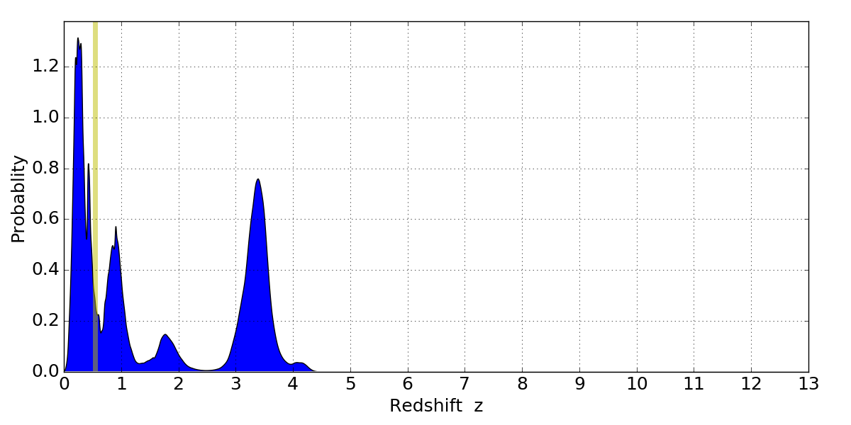 In P(z) plots: Yellow lines mark the cluster redshift z = 0.546,