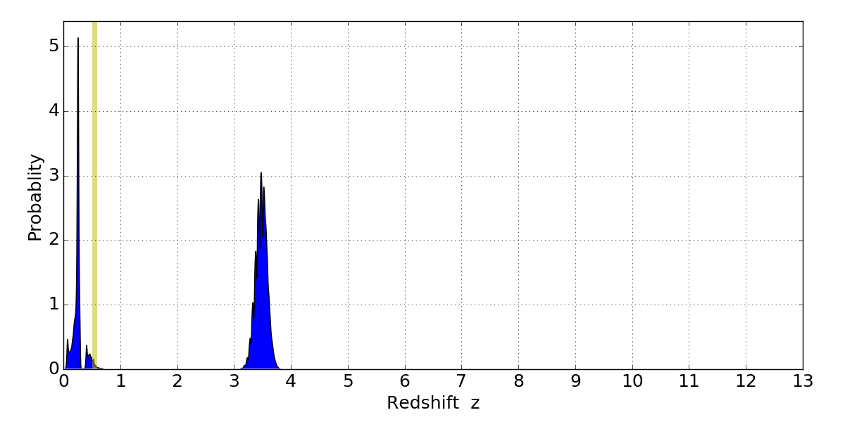 In P(z) plots: Yellow lines mark the cluster redshift z = 0.546,