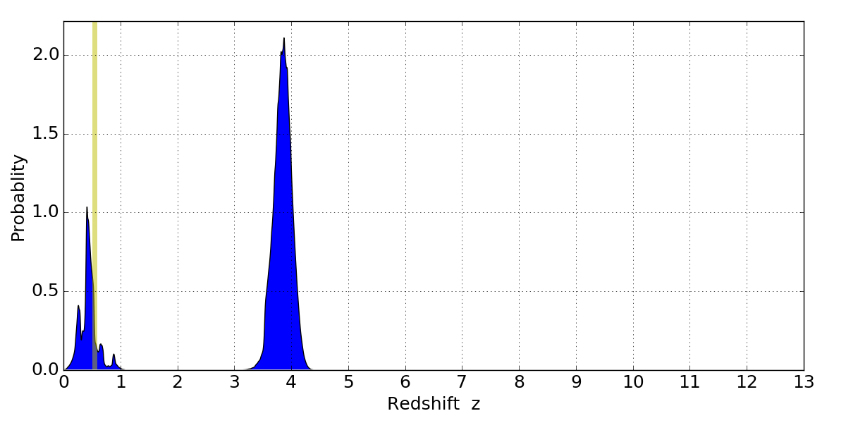 In P(z) plots: Yellow lines mark the cluster redshift z = 0.546,