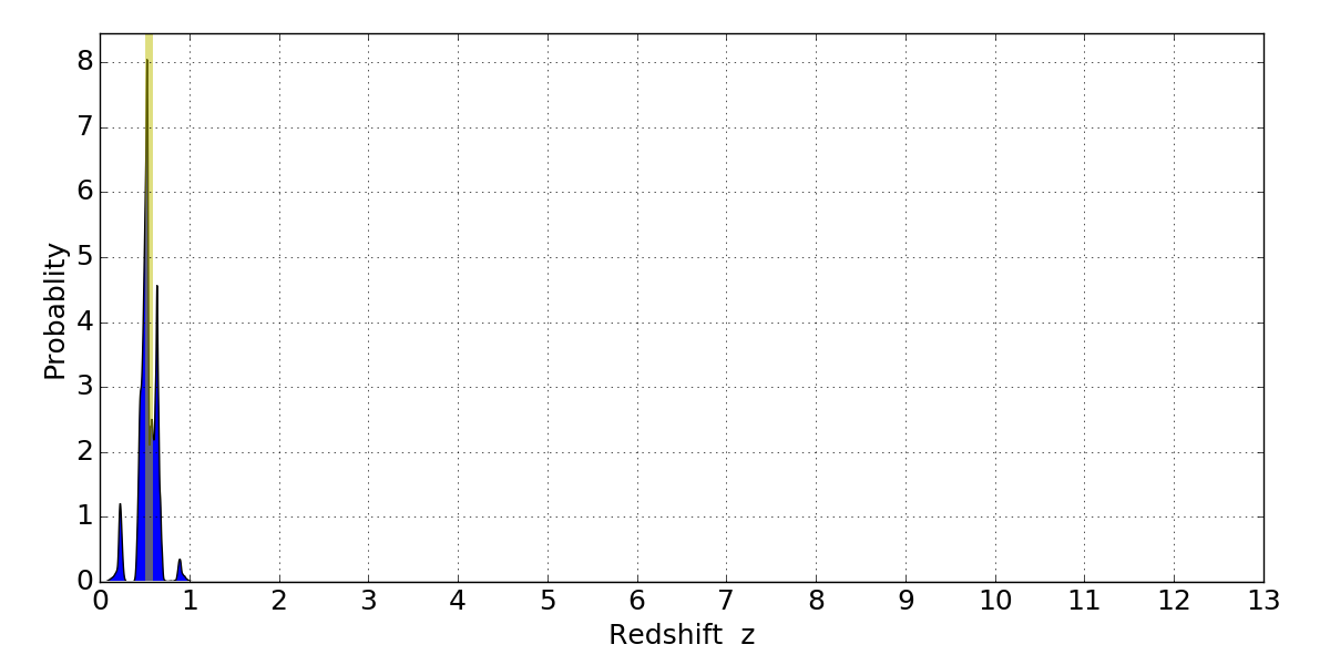 In P(z) plots: Yellow lines mark the cluster redshift z = 0.546,
