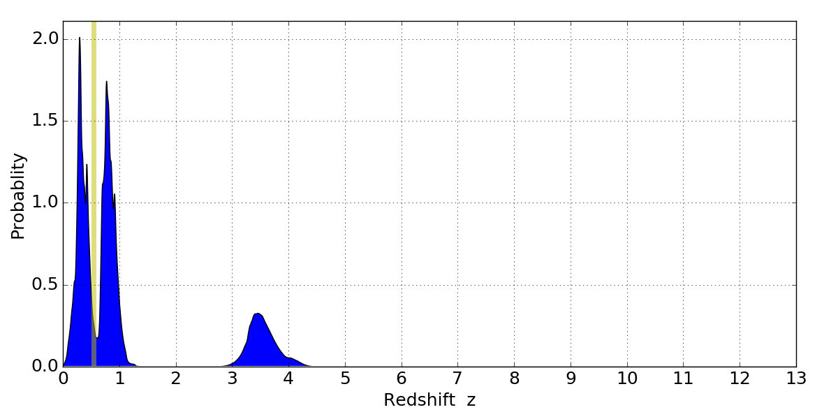 In P(z) plots: Yellow lines mark the cluster redshift z = 0.546,