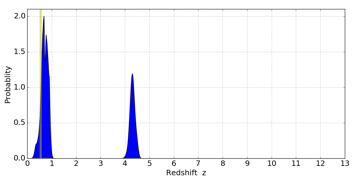In P(z) plots: Yellow lines mark the cluster redshift z = 0.546,