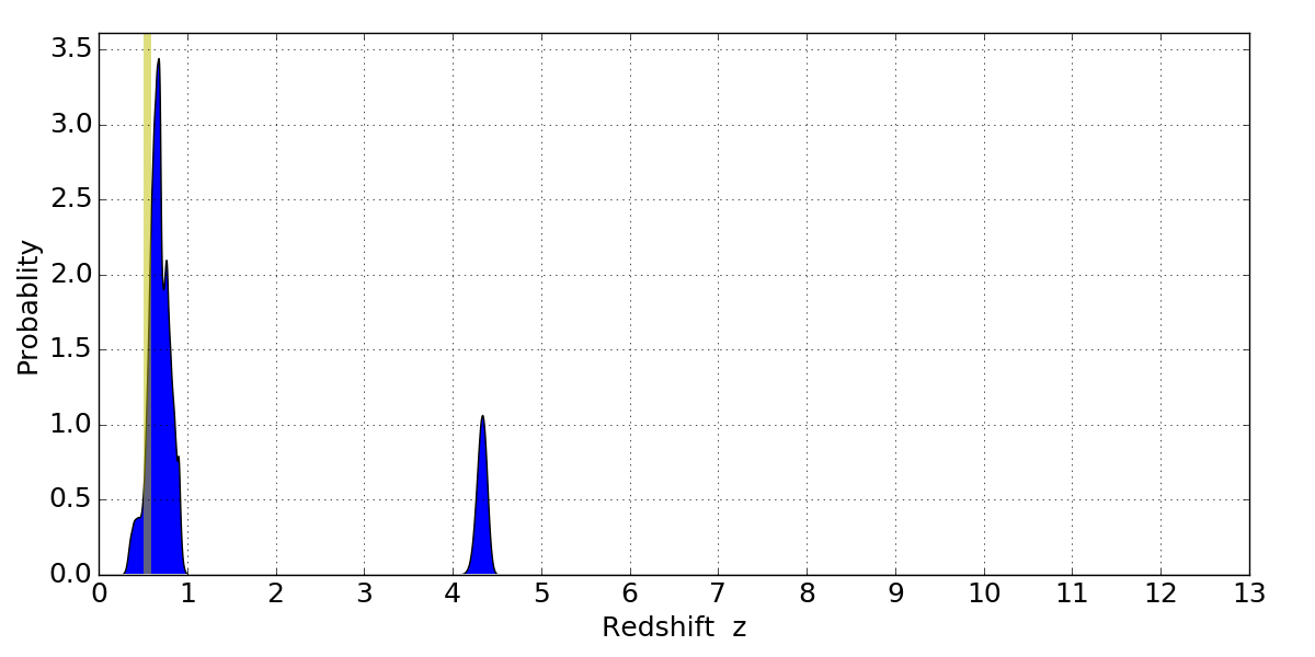 In P(z) plots: Yellow lines mark the cluster redshift z = 0.546,