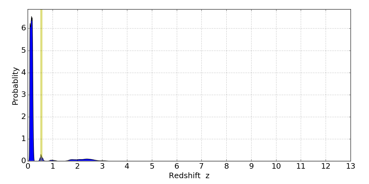 In P(z) plots: Yellow lines mark the cluster redshift z = 0.546,
