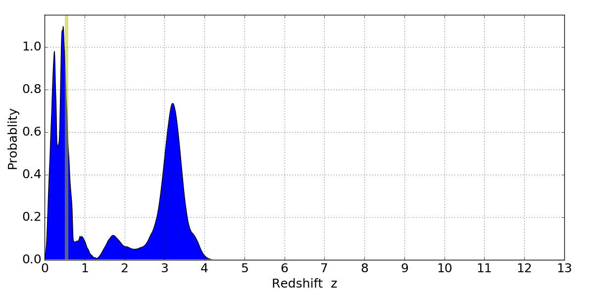In P(z) plots: Yellow lines mark the cluster redshift z = 0.546,