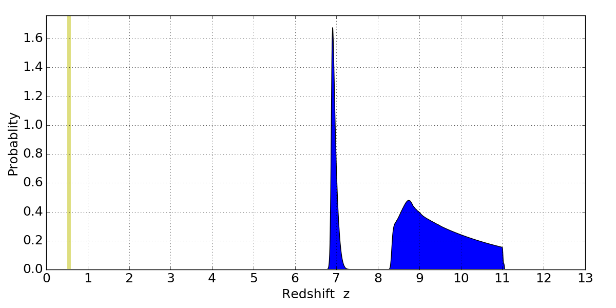 In P(z) plots: Yellow lines mark the cluster redshift z = 0.546,