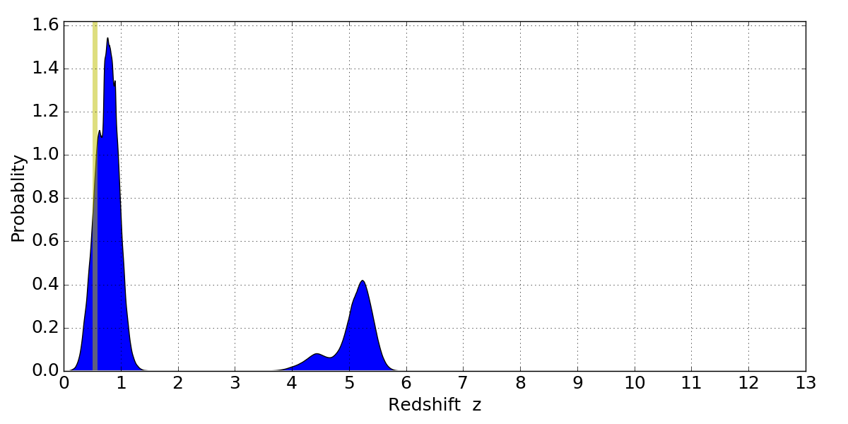 In P(z) plots: Yellow lines mark the cluster redshift z = 0.546,