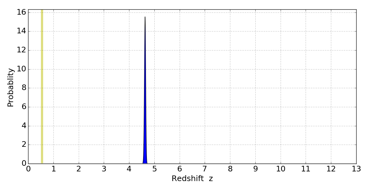 In P(z) plots: Yellow lines mark the cluster redshift z = 0.546,