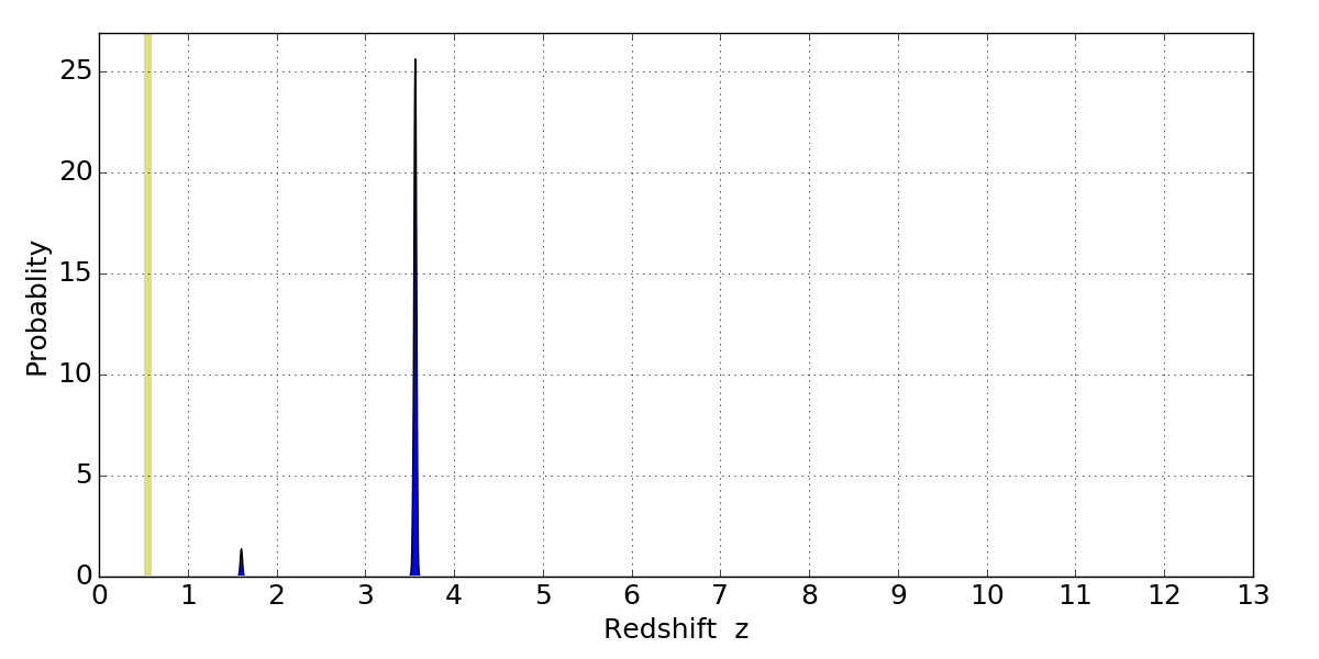 In P(z) plots: Yellow lines mark the cluster redshift z = 0.546,