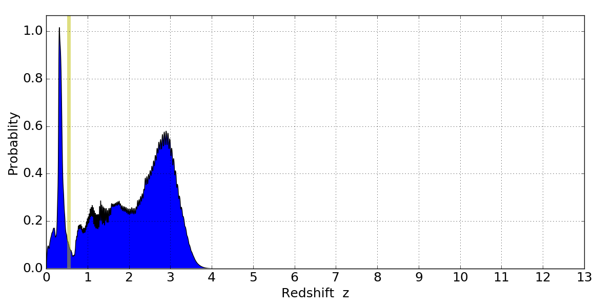 In P(z) plots: Yellow lines mark the cluster redshift z = 0.546,