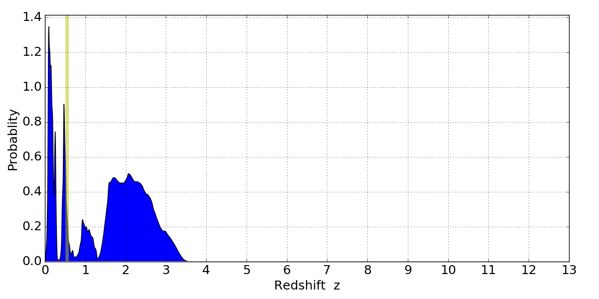 In P(z) plots: Yellow lines mark the cluster redshift z = 0.546,