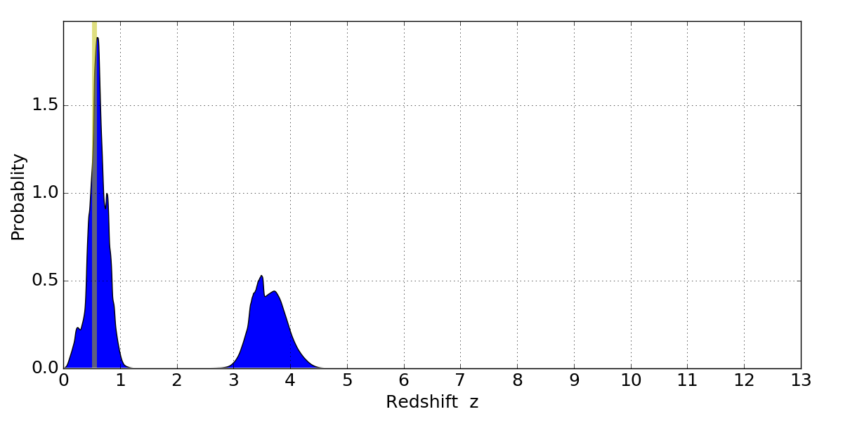 In P(z) plots: Yellow lines mark the cluster redshift z = 0.546,