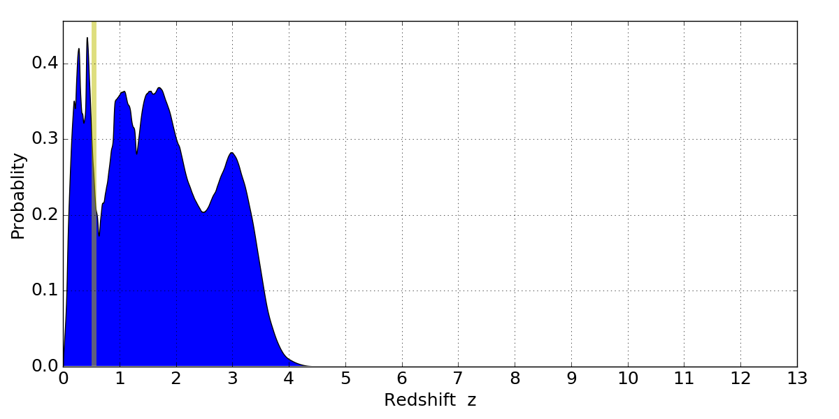 In P(z) plots: Yellow lines mark the cluster redshift z = 0.546,