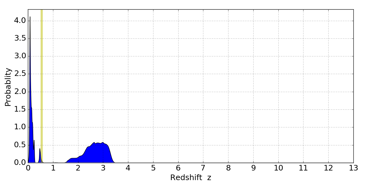 In P(z) plots: Yellow lines mark the cluster redshift z = 0.546,