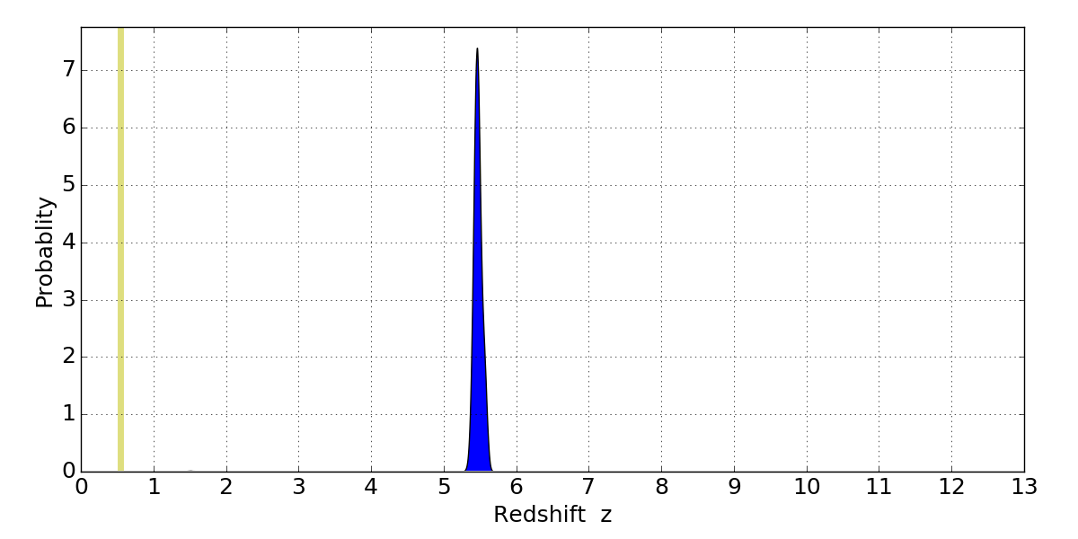 In P(z) plots: Yellow lines mark the cluster redshift z = 0.546,