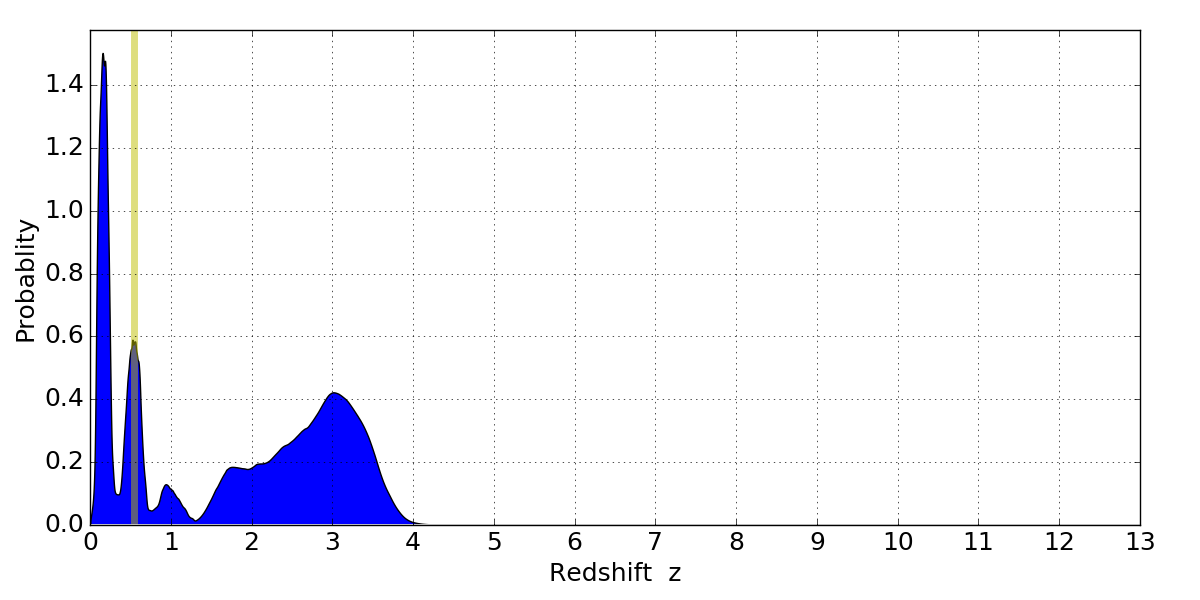 In P(z) plots: Yellow lines mark the cluster redshift z = 0.546,