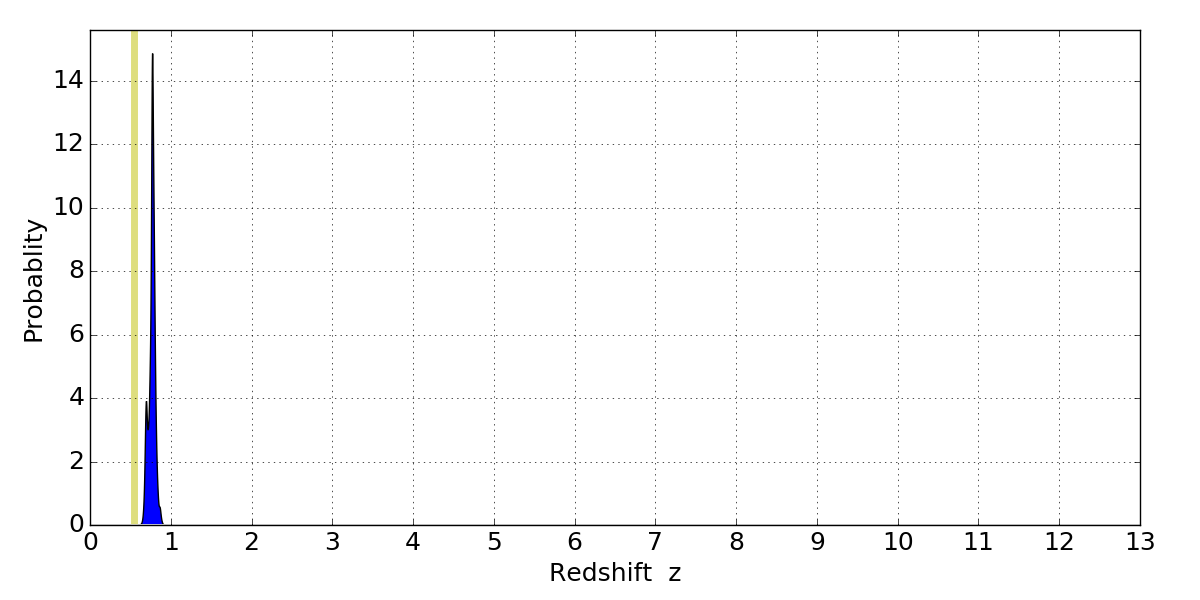In P(z) plots: Yellow lines mark the cluster redshift z = 0.546,