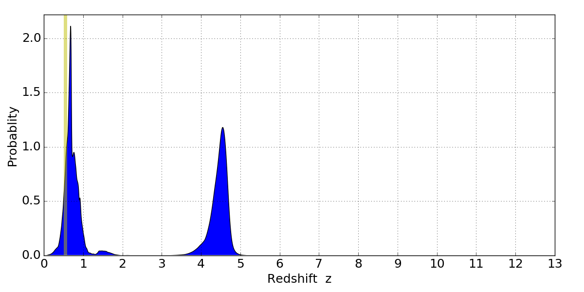 In P(z) plots: Yellow lines mark the cluster redshift z = 0.546,