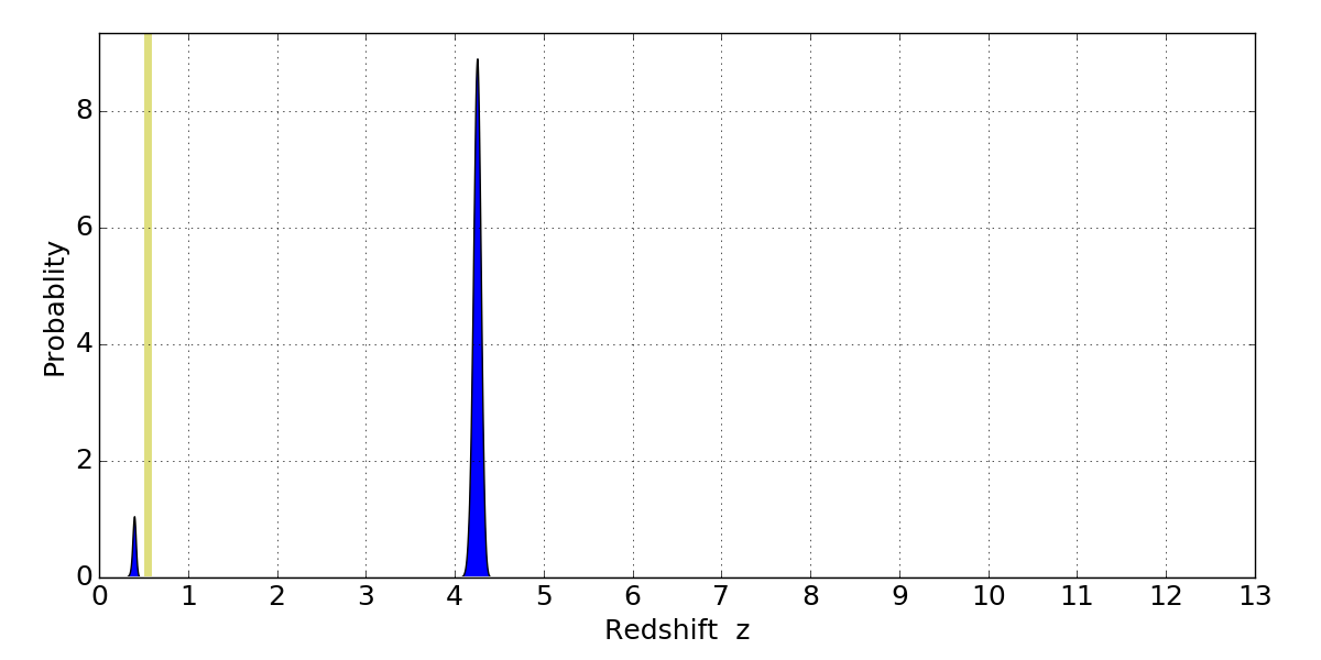 In P(z) plots: Yellow lines mark the cluster redshift z = 0.546,