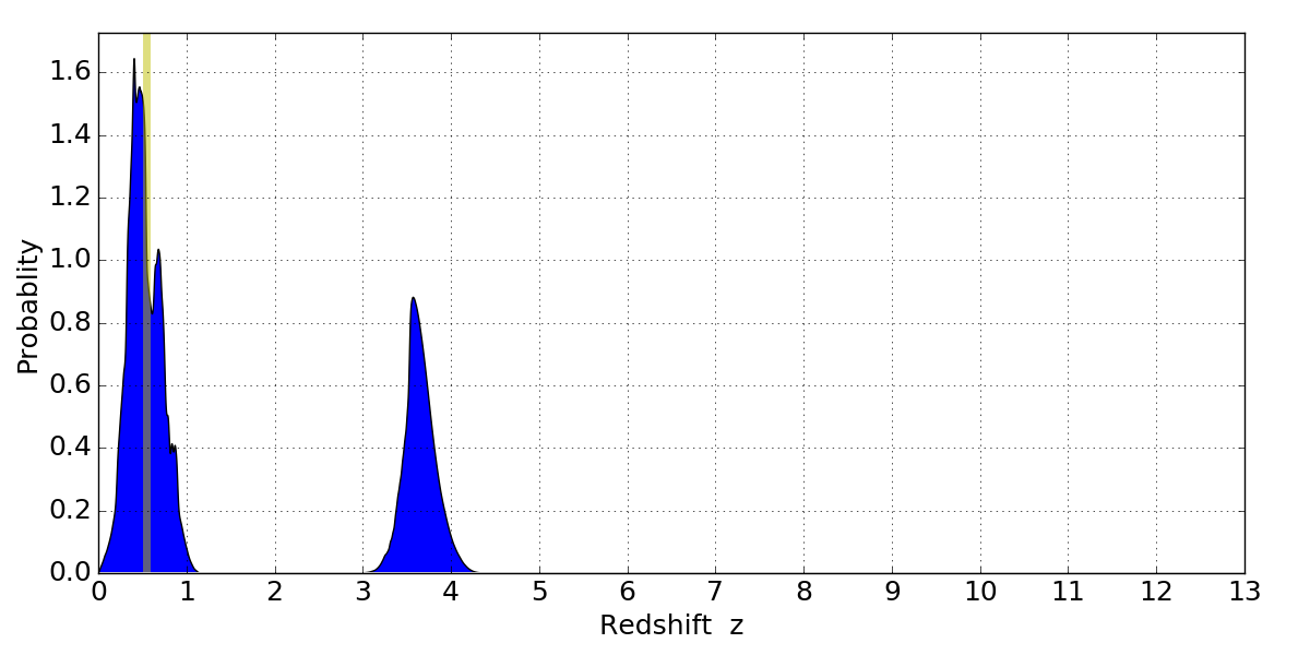 In P(z) plots: Yellow lines mark the cluster redshift z = 0.546,
