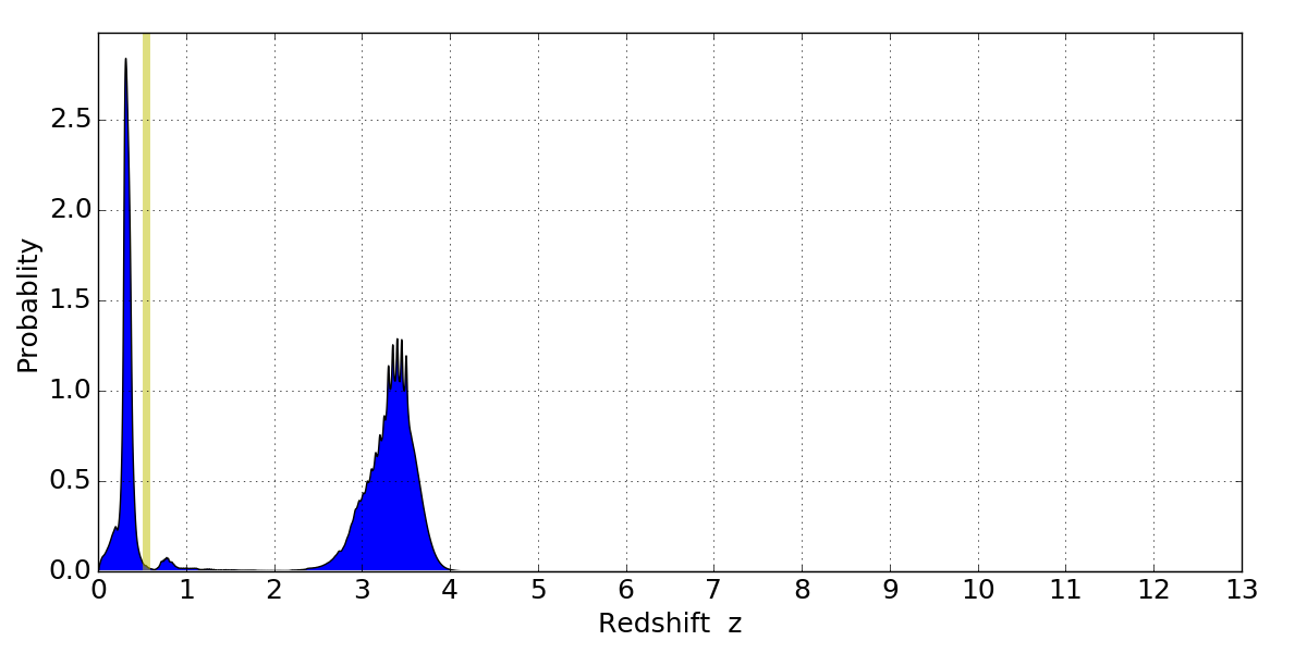 In P(z) plots: Yellow lines mark the cluster redshift z = 0.546,