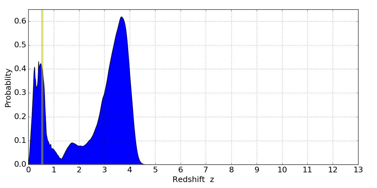 In P(z) plots: Yellow lines mark the cluster redshift z = 0.546,