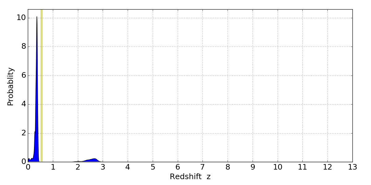 In P(z) plots: Yellow lines mark the cluster redshift z = 0.546,