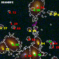 Black segments are analyzed here. Roll mouse over color images to view segments. Best viewed in a wide browser window (1200 pixels or more). Download SED & P(z) plots to view larger versions.