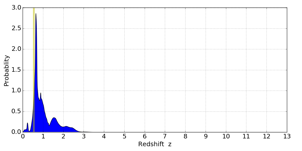 In P(z) plots: Yellow lines mark the cluster redshift z = 0.546,