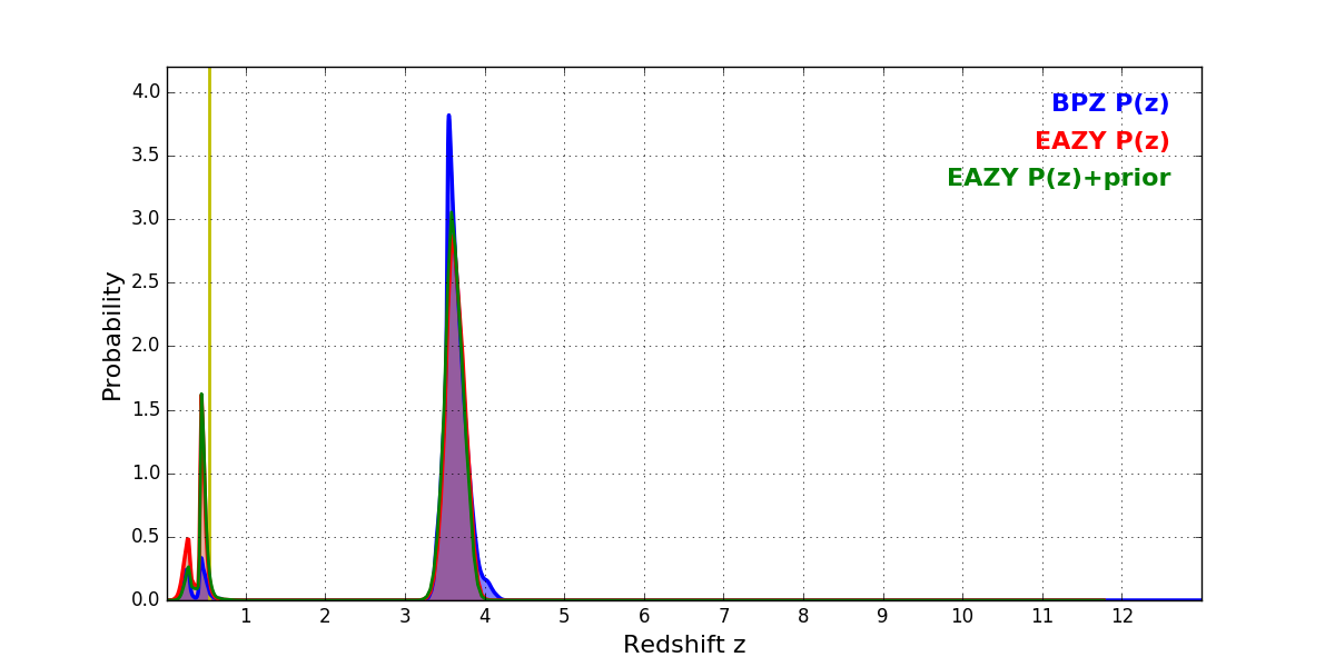 In P(z) plots: Yellow lines mark the cluster redshift z = 0.546,
