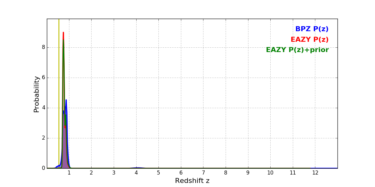 In P(z) plots: Yellow lines mark the cluster redshift z = 0.546,
