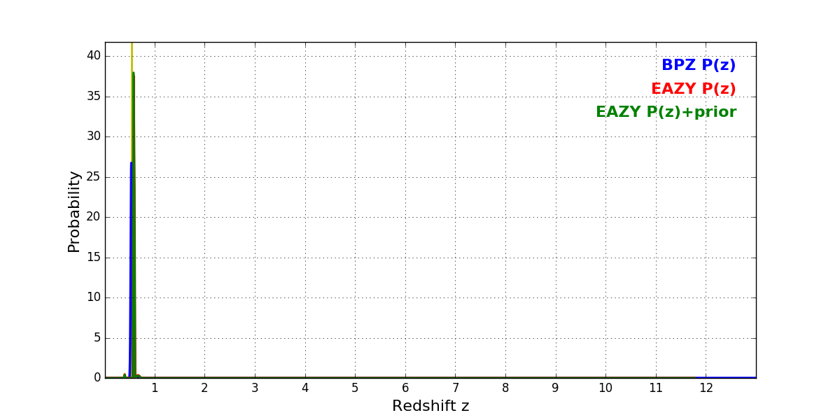In P(z) plots: Yellow lines mark the cluster redshift z = 0.546,