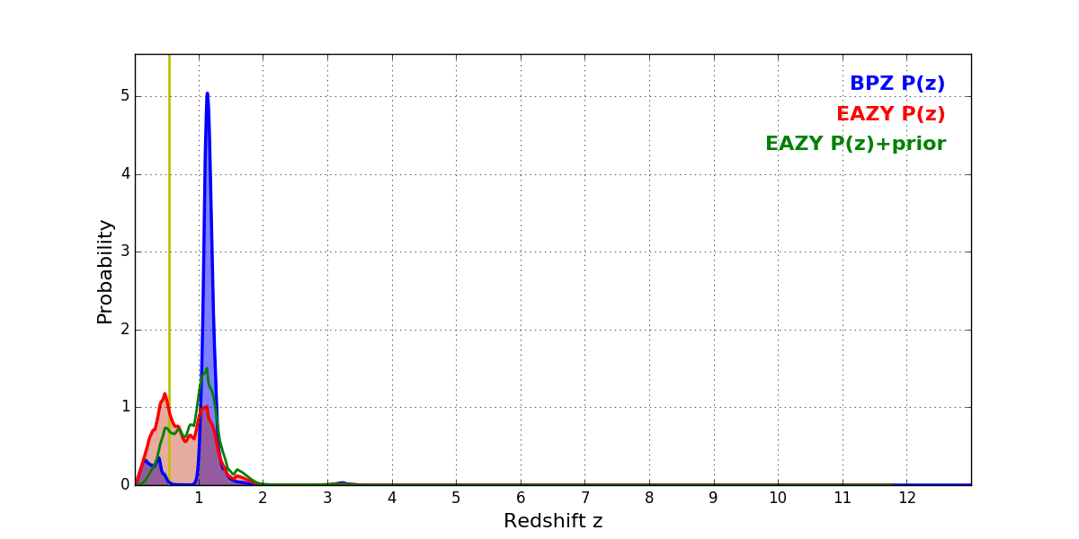In P(z) plots: Yellow lines mark the cluster redshift z = 0.546,