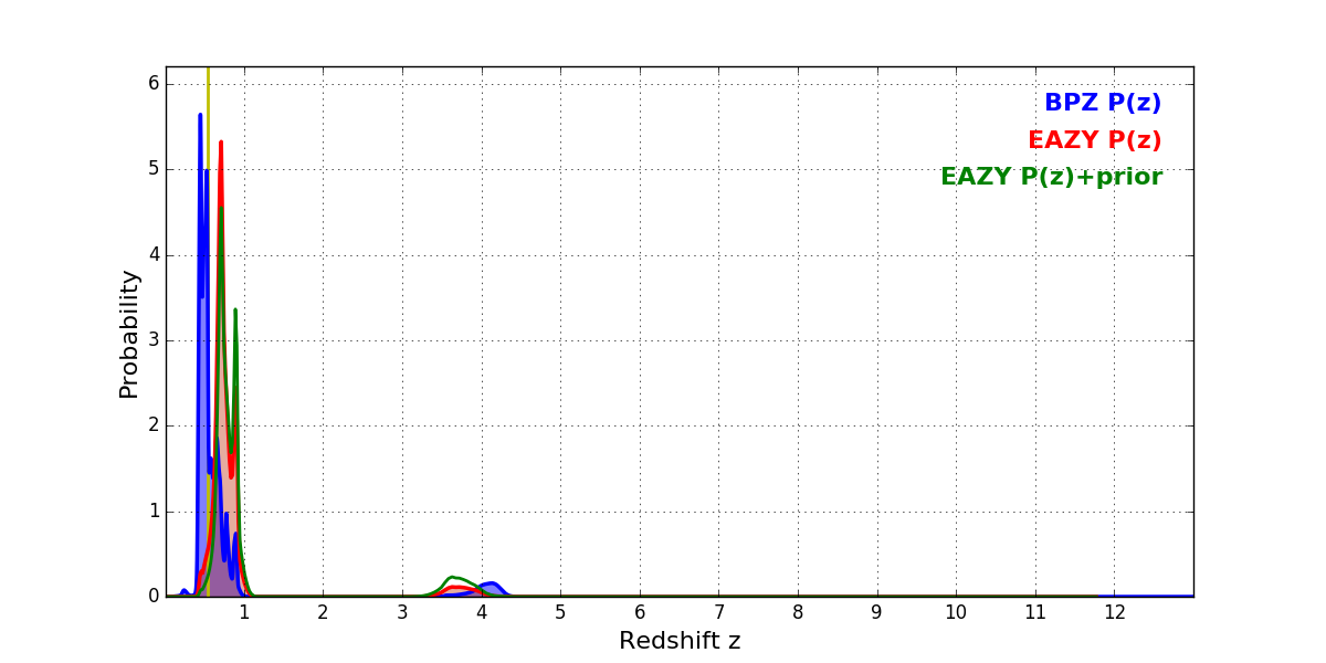 In P(z) plots: Yellow lines mark the cluster redshift z = 0.546,